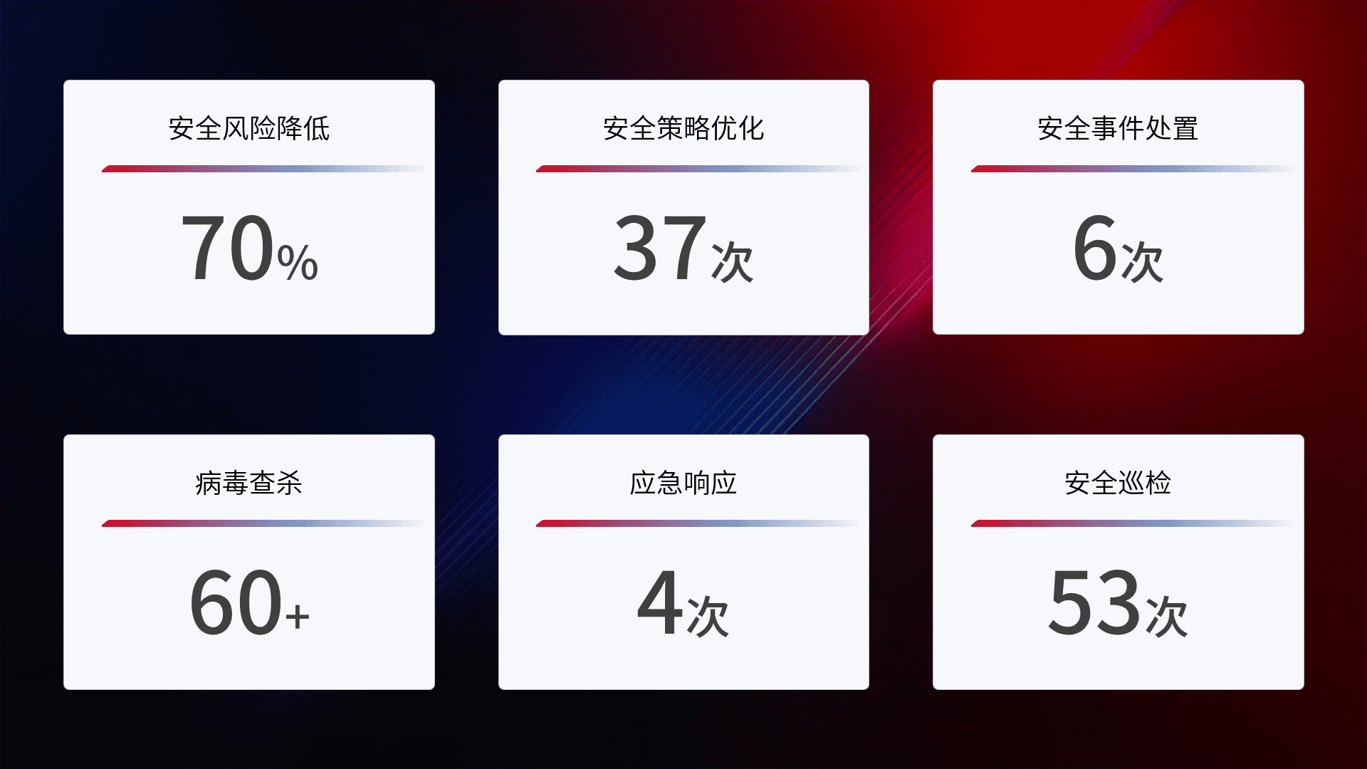 提供全面的安全事件报告体系,,,包括处置报告、、、周报、、、季度和年度总结,,,,结合持续监控,,,帮助客户深入了解网络安全状况。。。。