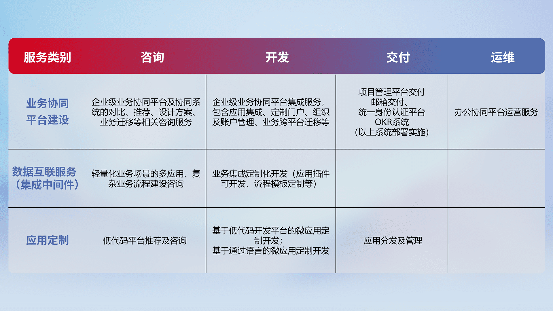 针对钉钉、、企微、、、IDaas等平台级产品提供产品的规划、、方案、、、、交付、、、定制化开发等服务,,实现如统一协同办公、、、智能客户服务、、、混合会议管理、、、智能数据查询、、、、等业务场景,,,,实现数字化转型。。。