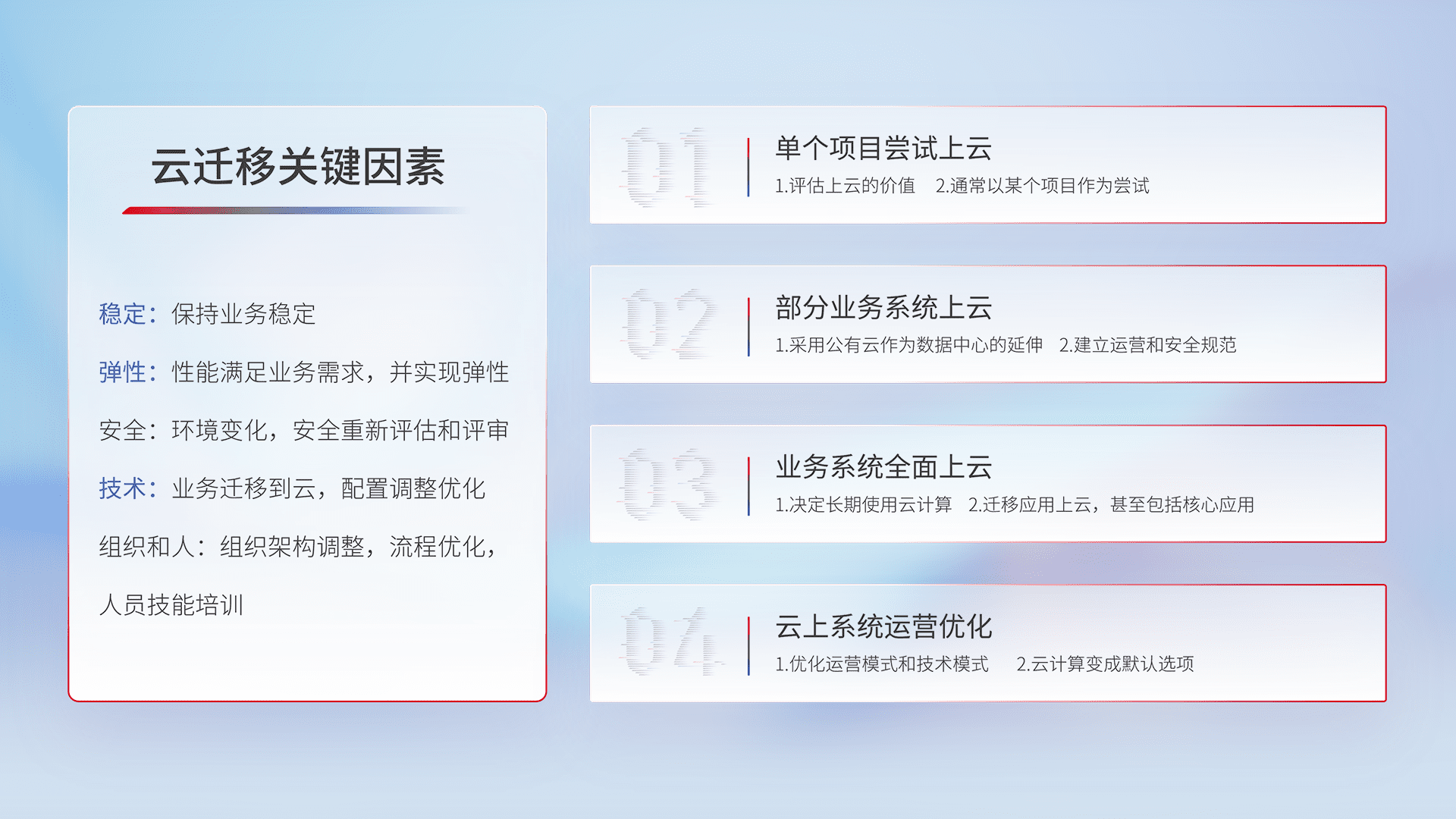 结合实际业务,,从规划设计、、、、云平台选型、、、、云原生改造、、、、数据迁移、、集成交付,,,,迁移全过程为客户识别最佳上云路径,,,,做好风险识别管理,,,设计网络架构、、、身份权限、、安全审计合规、、、操作审计、、、、日志审计、、监控告警策略、、、多站点容灾设计等,,,,对云上基础设施进行整体规划,,,提升IT治理水平,,,,以满足弹性、、高可用、、高性能的需求。。