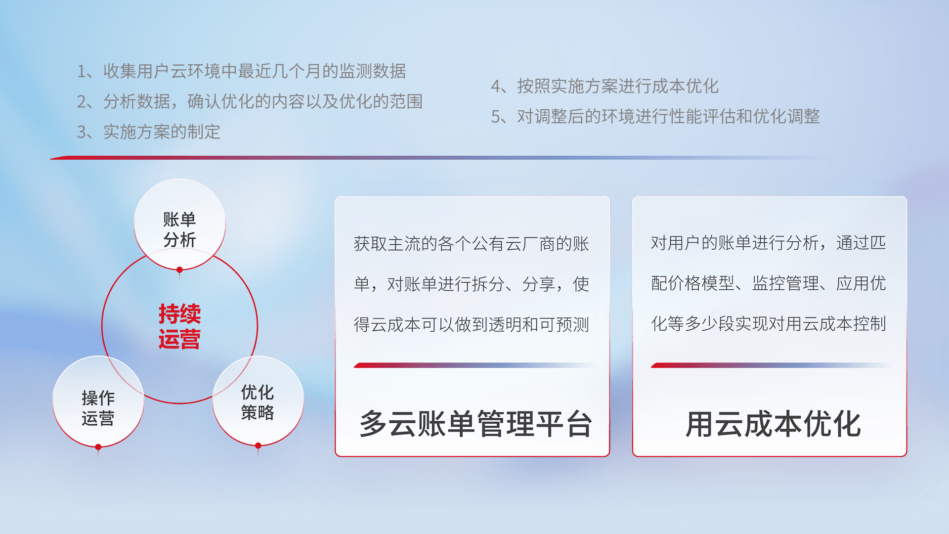通过多云纳管,,,以统一的资源数据模型把客户的云资源进行抽象和封装,,进而实现对多云资源的统一操作,,,,保障云资源管理的可靠性、、、稳定性与可用性。。。。量身定制化运维内容,,,配置、、开发运维、、、补丁管理、、、备份、、、监控、、、、认证和访问管理、、、、审计和日常巡检等,,保障在用云过程中的可靠度,,,稳定度以及高可用率。。。